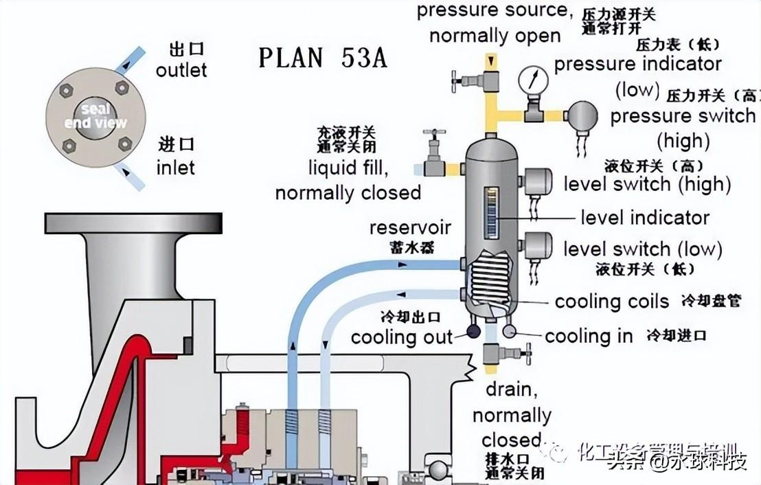 外部儲液罐為配置外側(cè)密封提供緩沖液,正常操作時,由內(nèi)部輸液環(huán)保持循環(huán),儲液罐連續(xù)排放蒸汽至蒸汽回收系統(tǒng),并保持比密封腔壓力小。