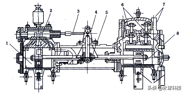 圖5 蒸汽直接作用往復(fù)泵1-汽缸;2-配汽機構(gòu);3-拉桿;4-搖臂;5-聯(lián)軸器;6-排出閥;7-吸入閥;8-液缸