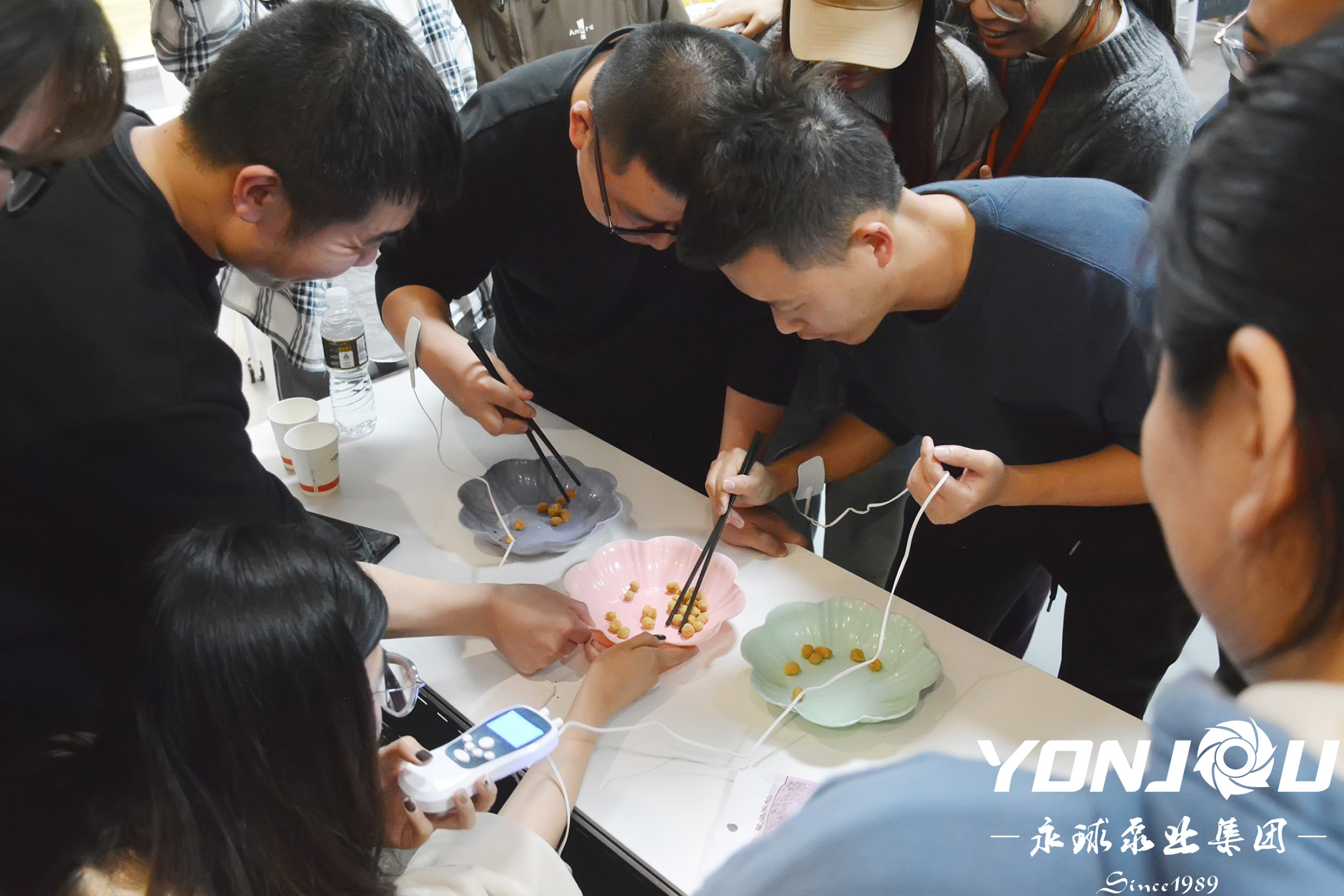 雙方選手手持筷子,緊盯著面前的豆子碗,準備展開一場激烈的較量。