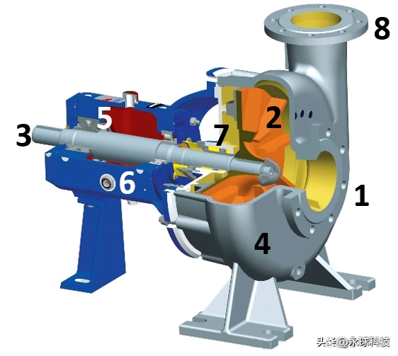 離心泵是一種旋轉動力水力機械,通過將葉輪的機械能傳遞到不可壓縮的流體,并將其轉換為動能或壓力能。流體通過吸入管進入葉輪,葉輪具有一系列的葉片,利用離心力將流體推向泵的蝸殼或泵體(或者在泵具有一級以上的情況下到達其它級葉輪),最終通過出口管排出。